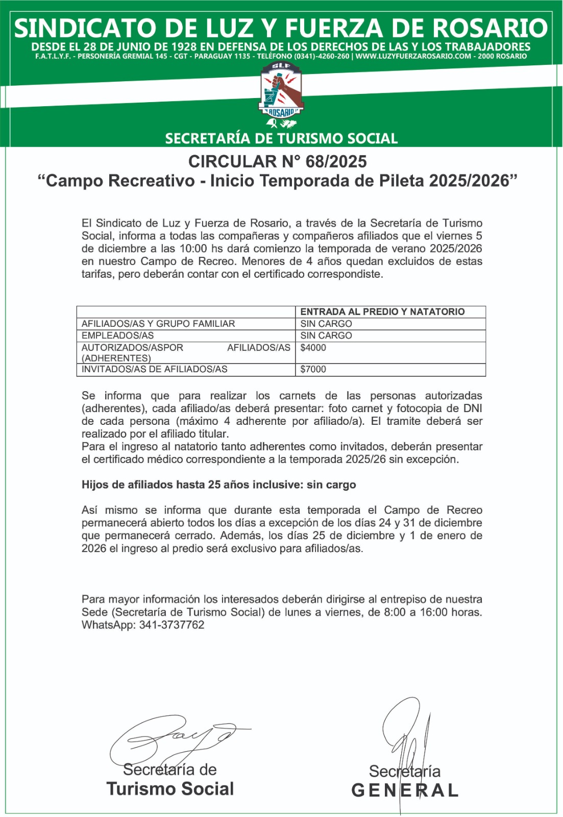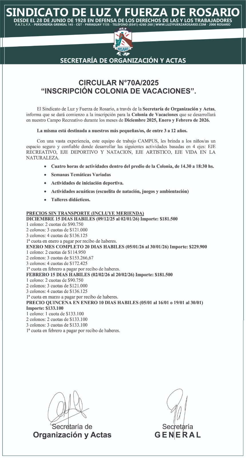 El Sindicato de Luz y Fuerza de Rosario dio a conocer las circulares oficiales con toda la información sobre la Colonia de Vacaciones 2025/2026 y el inicio de la temporada de pileta en el Campo Recreativo, destinada a las familias afiliadas y adherentes.