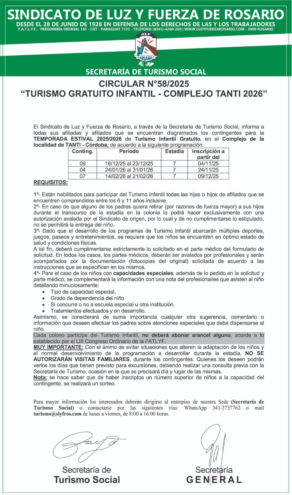 Circular N° 58/2025: «TURISMO GRATUITO INFANTIL – COMPLEJO TANTI 2026».