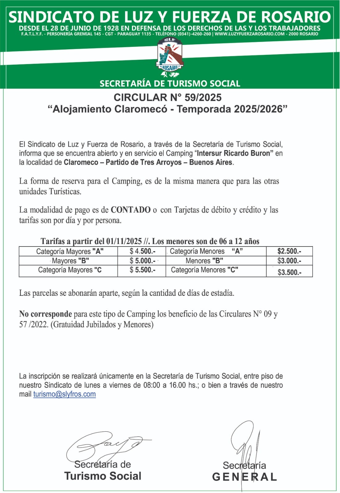 Circular N° 59/2025 : «Alojamiento Claromecó – Temporada 2025/2026».