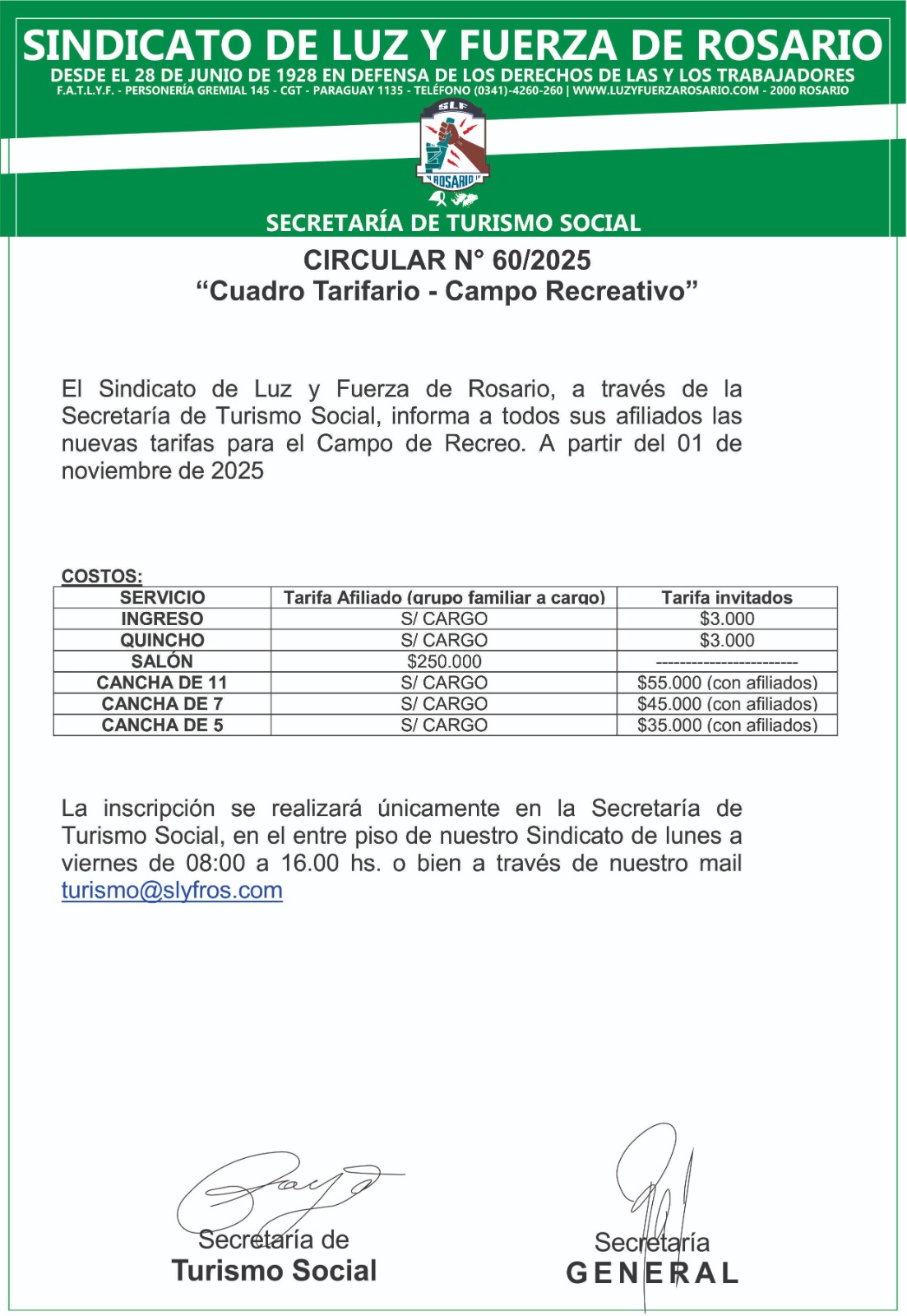 • Circular N° 60/2025 : «Cuadro Tarifario – Campo Recreativo».