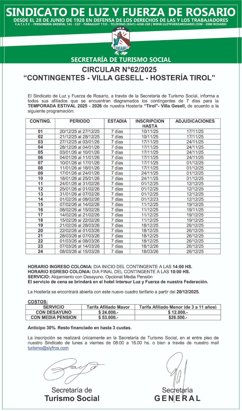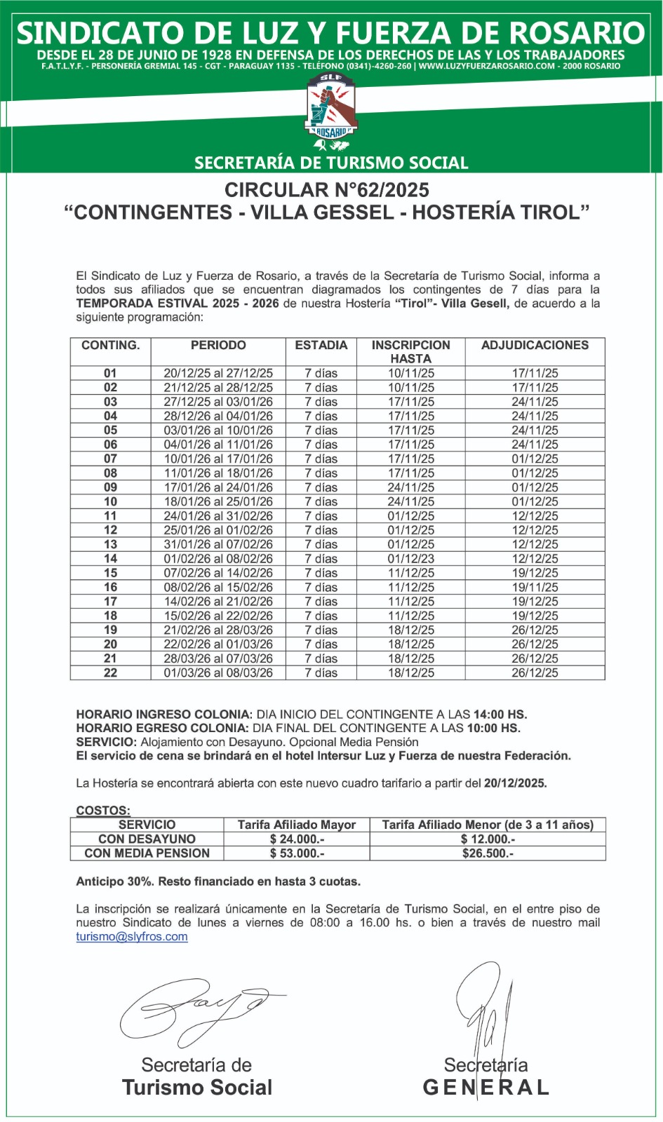 Circular N° 62/2025: «CONTINGENTES – VILLA GESSEL- HOSTERÍA TIROL».