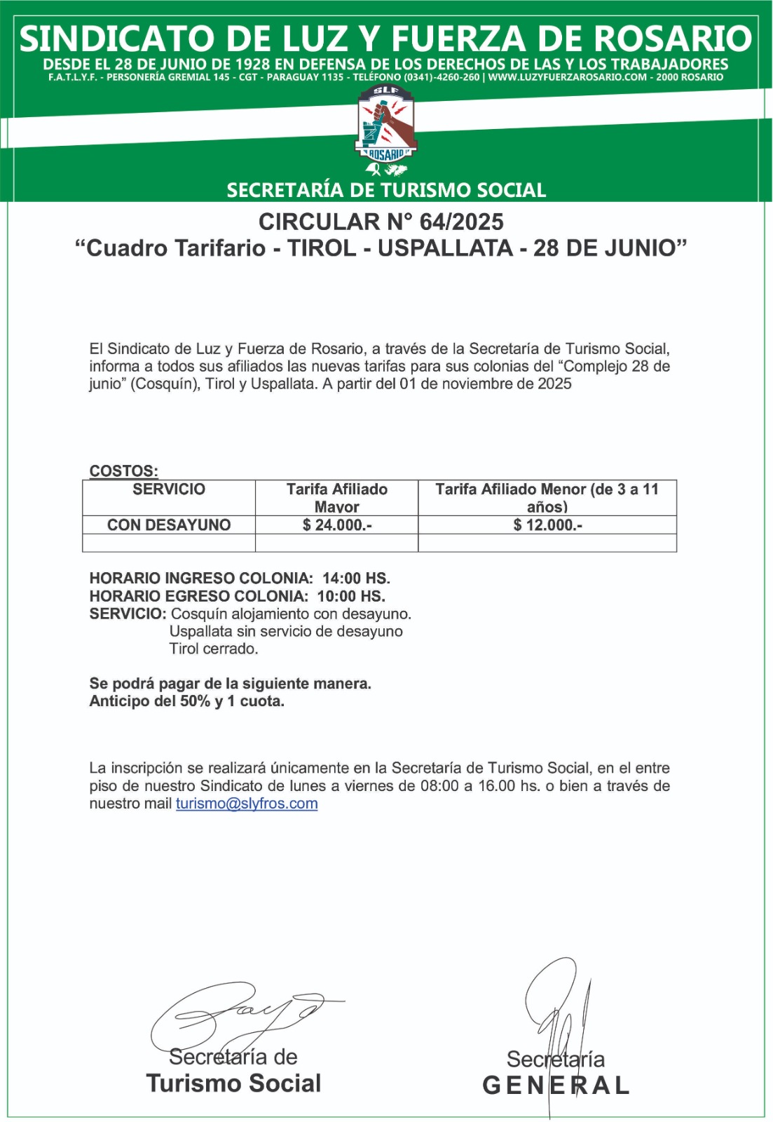Circular N° 64/2025 : «Cuadro Tarifario – TIROL – USPALLATA – 28 DE JUNIO».