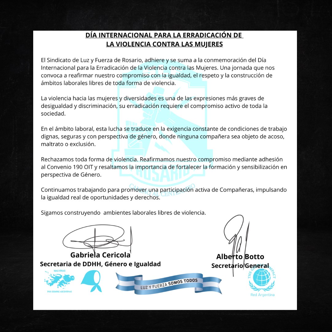 “Sigamos construyendo ambientes laborales libres de violencia”, concluye el comunicado firmado por Gabriela Cericola, secretaria de DDHH, Género e Igualdad, y Alberto Botto, secretario general del Sindicato de Luz y Fuerza de Rosario.